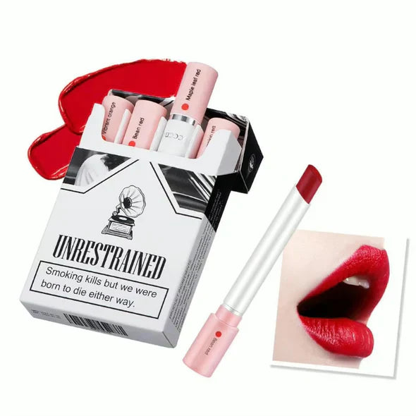 Elevate your makeup routine with CigGlam™, a bold lipstick set featuring a playful, cigarette box-inspired design and a long-lasting, matte formula. This innovative collection delivers vibrant, waterproof color that enhances your complexion while keeping your lips flawlessly bold from day to night. Whether you're aiming for a striking statement or a subtle, natural tint, CigGlam™ offers versatile shades that complement all skin tones, making it perfect for everyday wear or special occasions. With its compact, quirky packaging, it's not just fun to use but easy to carry, adding a unique and stylish touch to your beauty essentials.